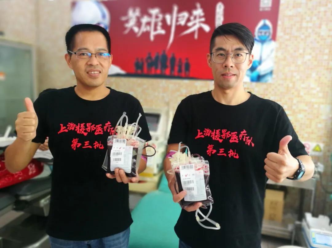 上午,在虹口区彩虹爱心献血屋,两位身穿印有“武汉”字样服饰的无偿献血者格外令人瞩目,他们是来自上海市第四人民医院的医生张益辉和吕晓慧。