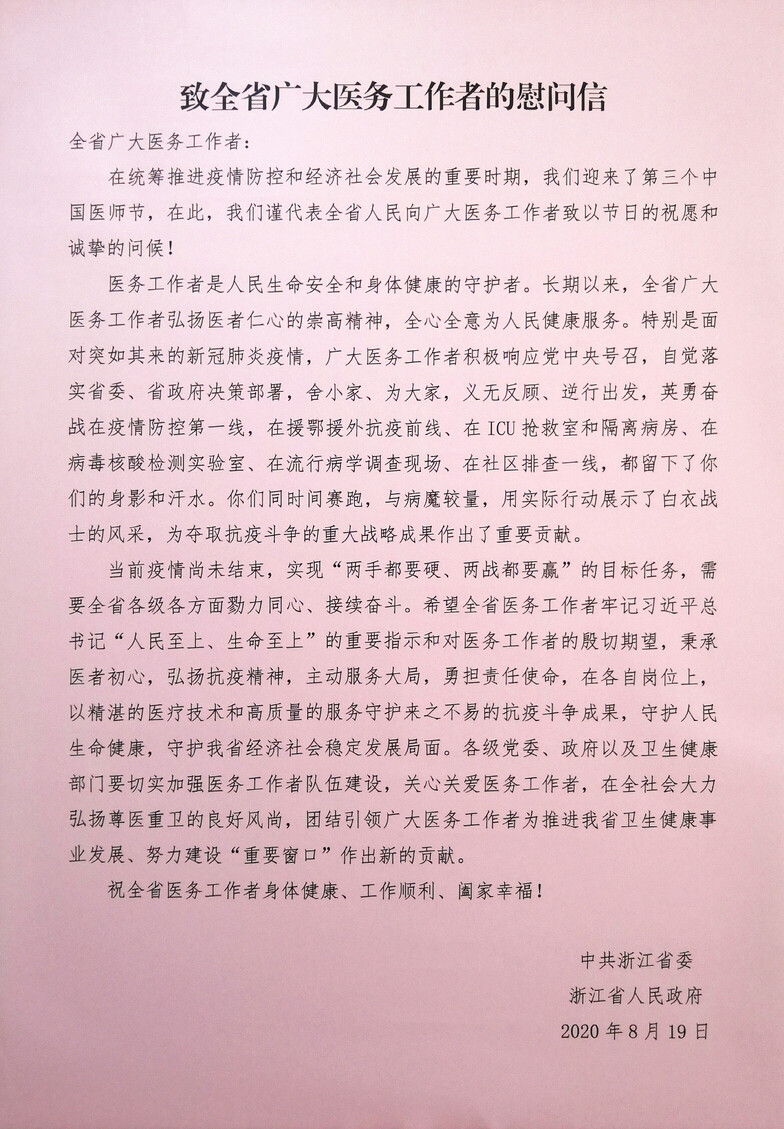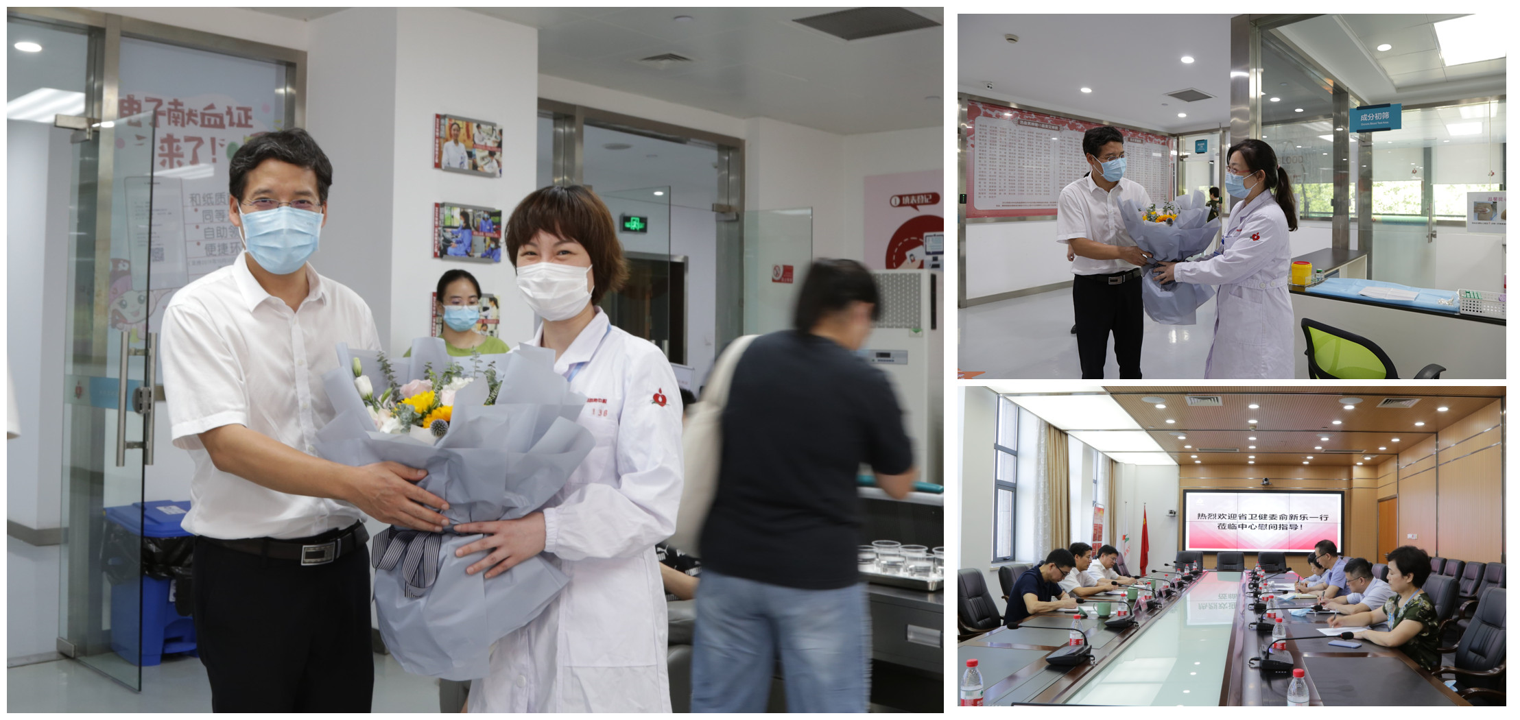2020年8月19日是第三个中国医师节。8月19日上午,浙江省卫生健康委副主任俞新乐、省卫生健康委体改处处长、二级巡视员申屠正荣、省卫生健康委医政医管处副处长孙卫东一行来到浙江省血液中心,转达省委省政府致全省广大医务工作者的慰问信,走访慰问奋斗在血液一线的白衣战士们,向他们送上鲜花并致以节日的问候。