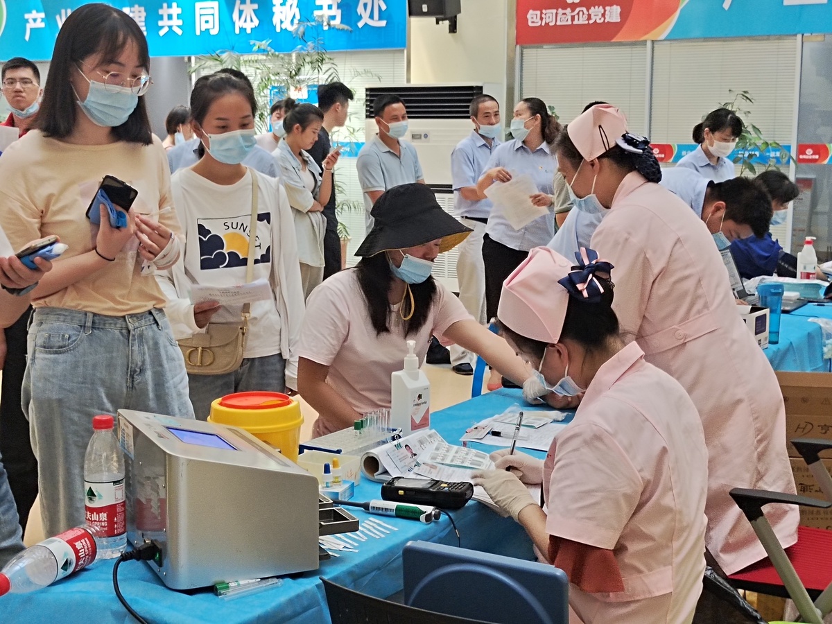 8月19日,我中心走进安徽青年电子商务产业园,本次活动由包河区经济开发区管委会发起,在安徽青年电子商务产业园的益企党群服务中心展开,辖区内的安徽丰原药业、安徽华人健康医药、合肥和君纵达数据科技等企业积极参与并提供志愿引导服务。从体温测量、填表登记、体检化验等,一切井然有序。