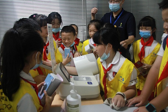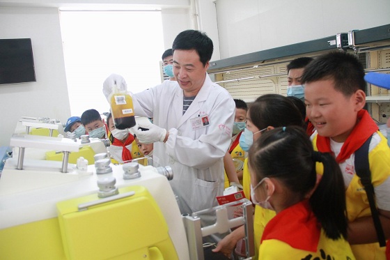 然后,小朋友们在工作人员地带领下依次参观了血站各业务场所。在机采室,他们见到了很多志愿赶来捐献血液的叔叔阿姨们。刚开始,有些小朋友看到扎针现场还有些害怕,但孩子们知道血液是不能通过人工合成,只能从献血者身体的血管里获得,大家又都觉得这些叔叔阿姨们很勇敢很可敬,他们向这些献血英雄们集体献上少先队员队礼。在检验科,大家看到了很多装有血液样品的试管,并且了解到,采集的血液只有经过严格的检验确保安全后才能够被用到病人身上。在成分科,他们亲眼见证了一袋血液是如何被神奇地分离成血浆和血细胞两部分,这些不同的血液制品颜色不同,用处也各有不同。最后,他们来到存放血液制品的血库,看到了许多贴着标签的血袋被整齐地放置在冰箱里。工作人员告诉他们,这些血液即将被运送到各个医院里,流淌进许多急需病人的血管中,并且能拯救许许多多珍贵的生命。通过这种直观的方式,小朋友们完整见证了这一趟红色的爱心旅程。
