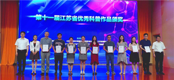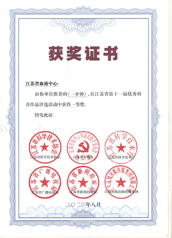 启动仪式上,第十一届江苏省优秀科普作品评选结果揭晓。省血液中心推选的视频 “一分钟”荣获新媒体类一等奖,中心献血服务科副科长蔡丽娜上台领取荣誉证书。