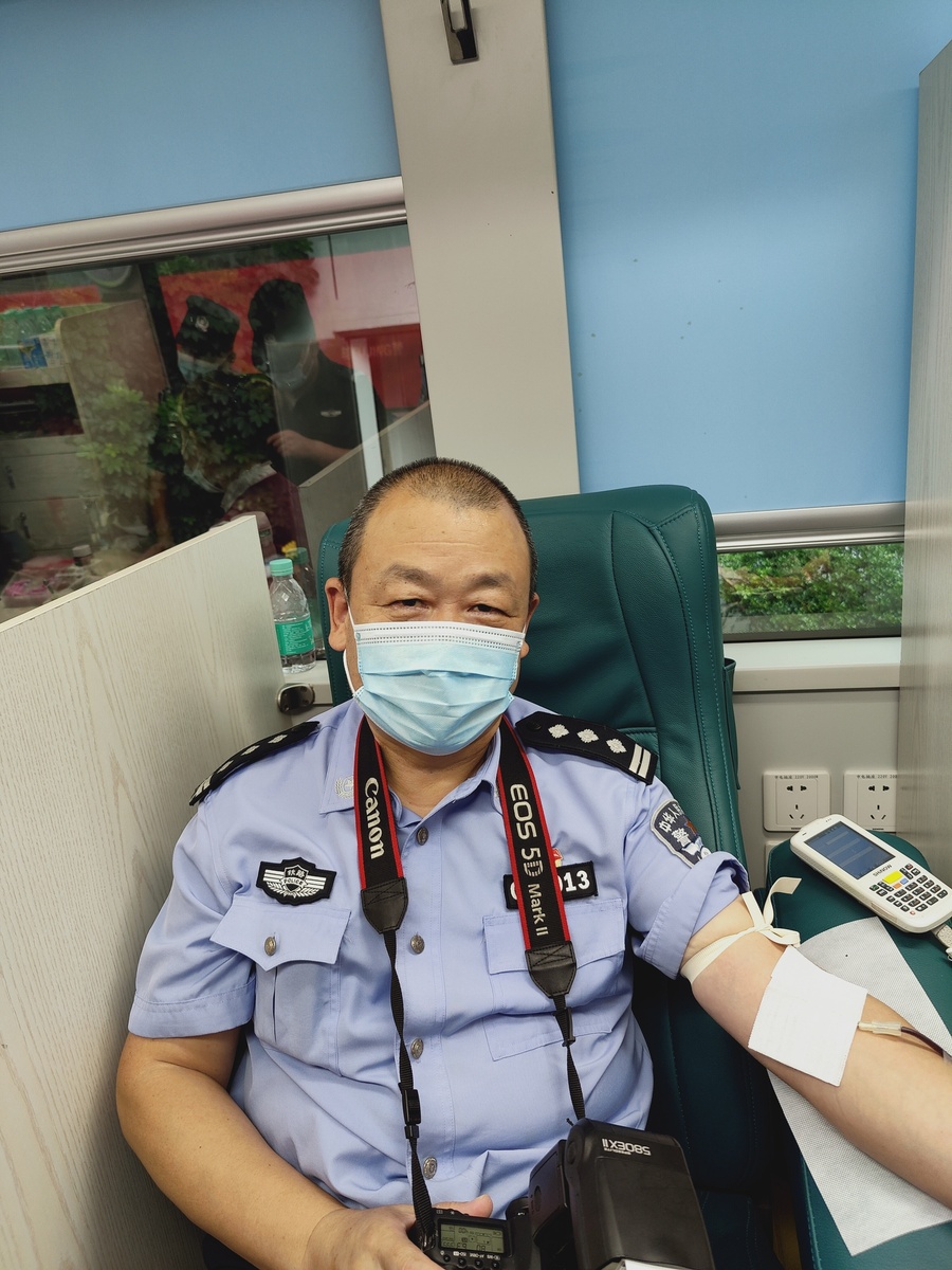 王警官今天是“兼职”担任随车摄影师,他是相当的敬业,自己参与献血的同时,不忘给更多同事留下这有意义的采血瞬间。左手因检测扎的手指头还在用棉签压迫止血,右手举起相机就咔嚓咔嚓地拍个不停,一刻也闲不下来......这样敬业的态度,让我们很多人都为他竖起大拇指。