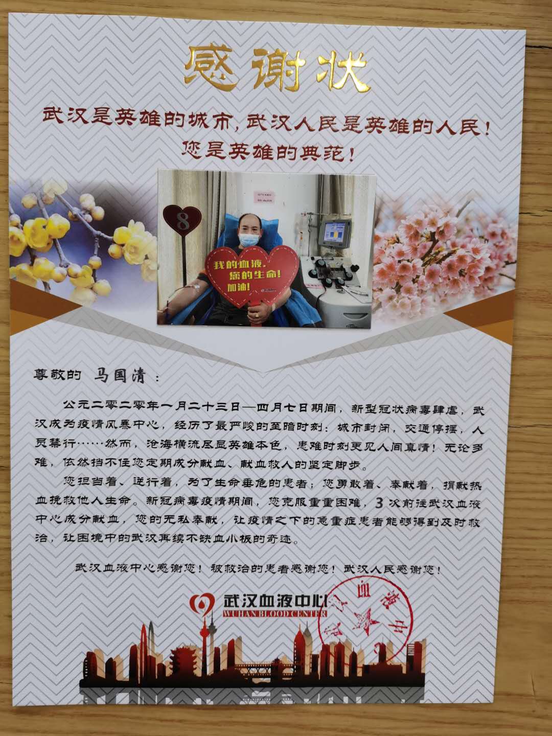 武汉血液中心给马国清的感谢状