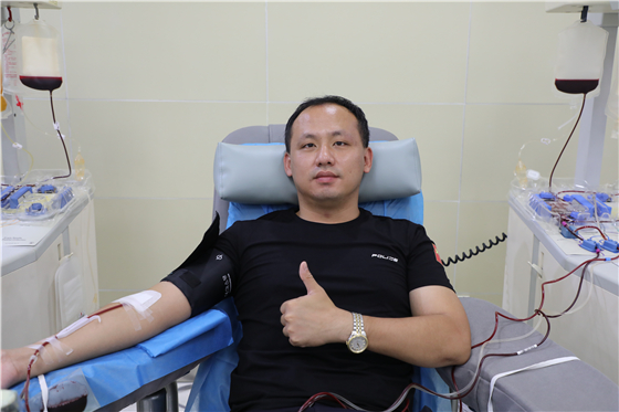 (湖南省高速公路警察局郴州支队汝城大队综合中队长李江正在捐献机采血小板)