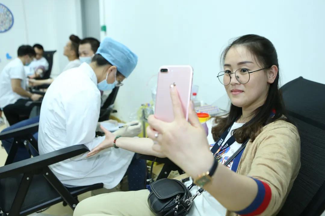 “这是我第6次无偿献血了,公司每次开展团体无偿献血活动都会参加的,每次都献了400ml。”说这话的人叫王盆芳,她献血时还不忘掏出手机一阵自拍。