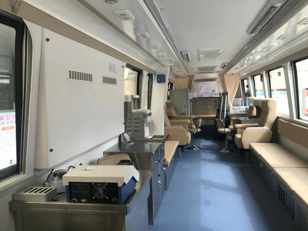 车体内配备了完善的医疗卫生设备:采血计量仪、热合机、血压计、储血冰箱、消毒机等医疗专用设备均选用国内外知名品牌。车内严格将污染区和非污染区分开、安装紫外线消毒灯,有效避免交叉感染。同时合理利用车内空间安装医疗设备,极大的提高车内空间利用率。