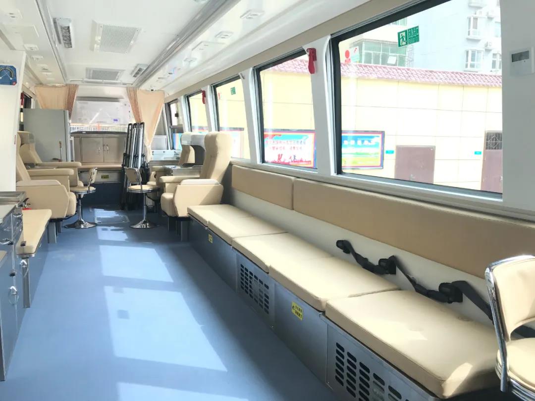 车体内空间更宽敞,内饰简洁、实用,布局科学,每个区域配备相应的工作台、物储纳柜及豪华的座椅设计,让献血者在头等仓般的舒适环境中体验献血,也让工作人员操作更加便利。