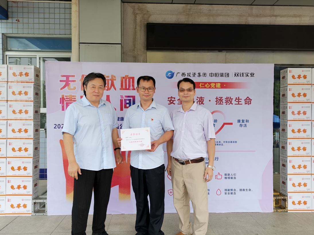在献血现场,梧州市中心血站站长谢崇利为获得“梧州市献血之星”的梧州制药固体车间员工聂攀奇颁发了荣誉证书,感谢他19年来默默奉献16400毫升血液救助他人。詹助理了解到职工聂攀奇的献血事迹后高度赞扬,与其亲切交谈,希望他把这份爱心、仁心持之以恒地坚守下去。