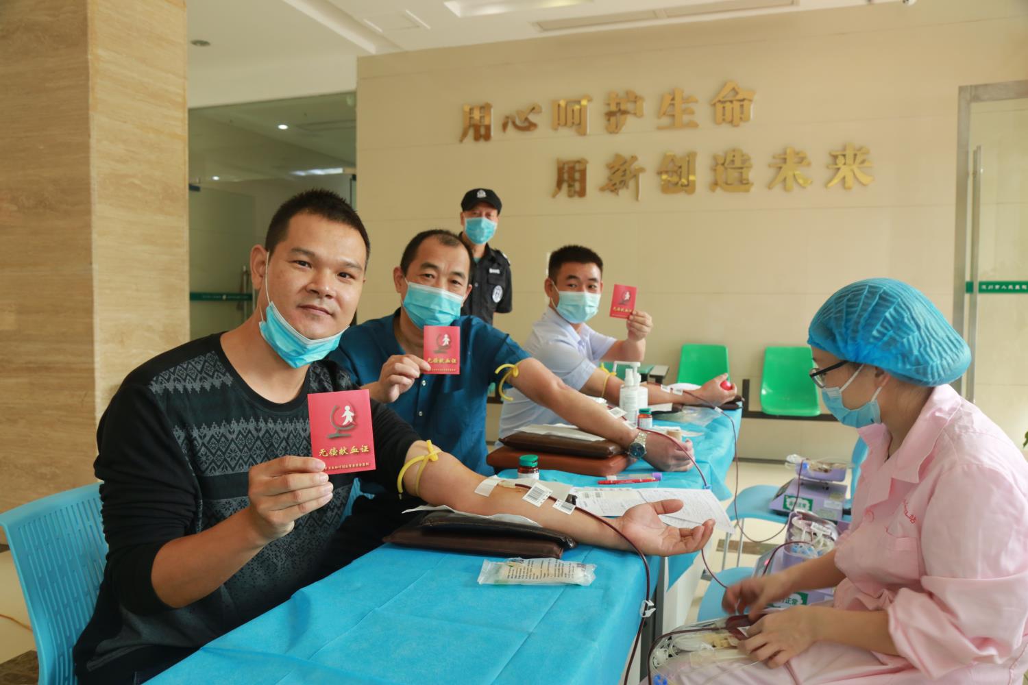 活动现场,大家在血站工作人员的引导下井然有序地接受体温监测、健康征询、填表、体检化验并献血。