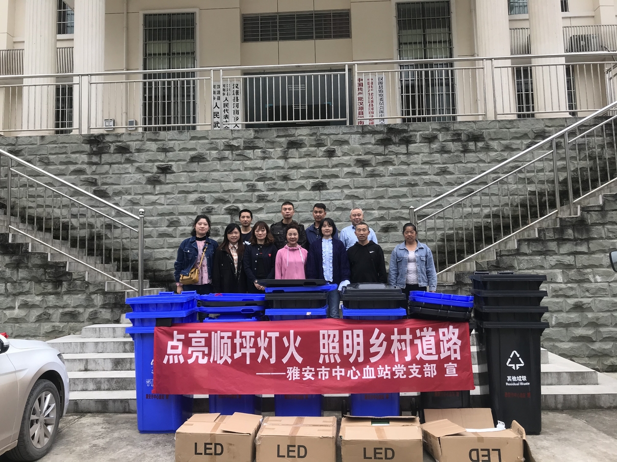 9月24日,市中心血站党支部书记、站长喻琼带领支委和党员一行8人来到汉源县河南乡顺坪村,开展主题为“垃圾分好类 健康中国行”、“点亮顺坪灯火 照明乡村道路”的健康扶贫活动。