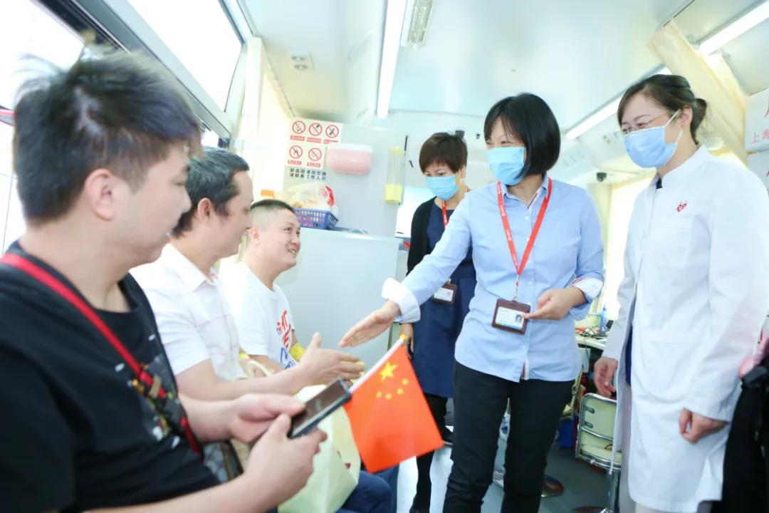 在无偿献血活动中,上海电机厂有限公司党委副书记、纪委书记、工会主席王红春,闵行区血液管理事务中心主任诸培红等领导登上爱心献血车向参加无偿献血的爱心职工表示感谢和慰问。