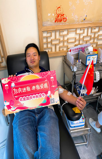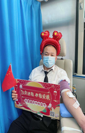10月1日,在这举国欢庆的日子里,各个献血点内爱心满满。孔明选一早和朋友来老街游玩时看到工作人员正在街头招募,他就勇敢伸出手臂参加无偿献血。他是第一次献血,体检合格后捐献了全血400毫升,并相约半年后再来奉献爱心。