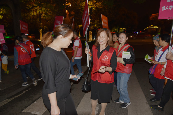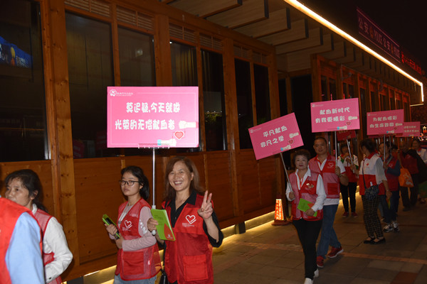 28日晚7时,无偿献血志愿者代表身着统一的红马甲,手持无偿献血宣传牌,从天元献血屋出发,沿天台路至炎帝广场进行健康徒步宣传活动。