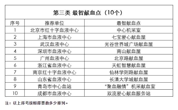 经前期初审、返修、审查、核实,全国共有155个最美爱心献血点(27个爱心献血车、128个固定爱心献血点)、31个最智献血点材料进入了推选阶段,最终有来自27个省、自治区、直辖市和部队的60个爱心献血点分获“全国最美献血点、最智献血点”称号。其中,全国最美献血点(爱心献血车)10个、全国最美献血点(房车/站内爱心献血点)40个、全国最智献血点10个。