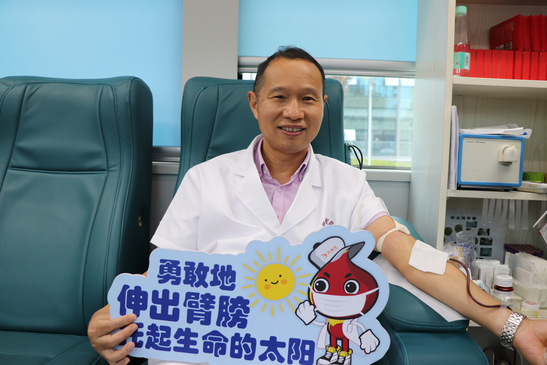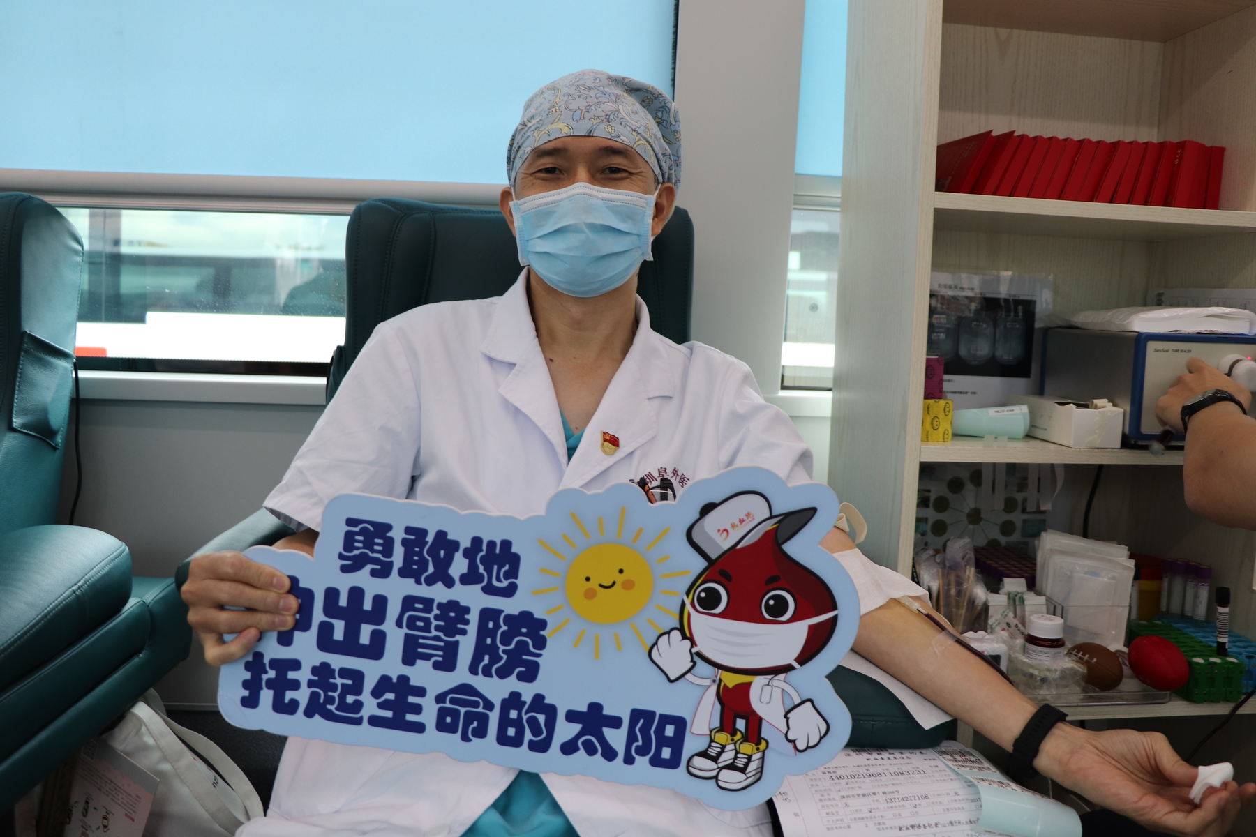 ICU 温主任,早早就登上献血车来献血了,给年轻小伙们做个坚强、大爱的表率~并鼓励今天献血首秀的同事们无需慌张~