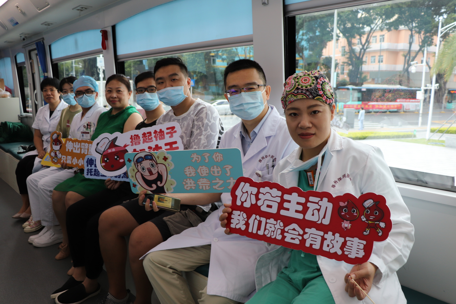 车上车下都人头攒动,两辆献血车的人流是一波赶着一波,一浪接着一浪~大家对献血这件事都是熟悉但不缺乏兴奋。等待献血的医护人员们围绕献血这件事说说笑笑,气氛热烈而轻松。