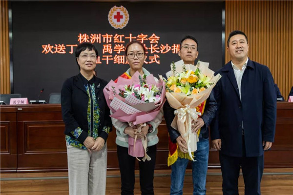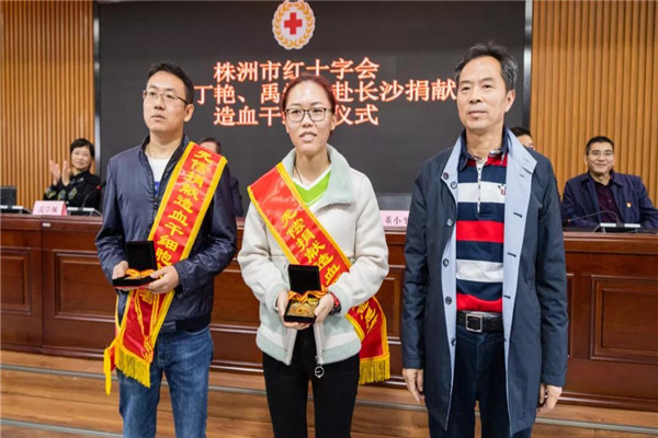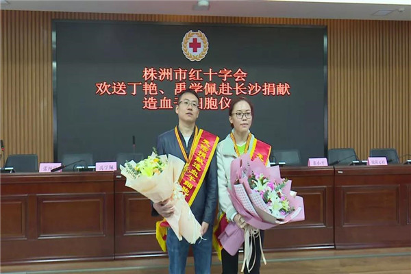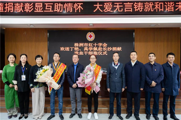 10月10日,我市第十三、十四例造血干细胞捐献志愿者丁艳、禹学佩捐献欢送仪式在株洲市中心血站举行。