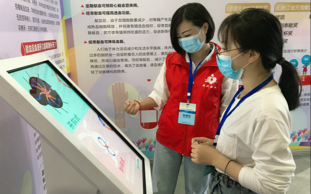 另一边,血液流程展示机也吸引了不少眼球,有别于一般的血液知识科普动画仪器,血液流程展示机还加入了交互性互动环节,让市民能根据自身的节奏学习、汲取有关人体血液循环、人体器官储血功能等血液知识,了解血液对于生命的重要性及无偿献血的意义。