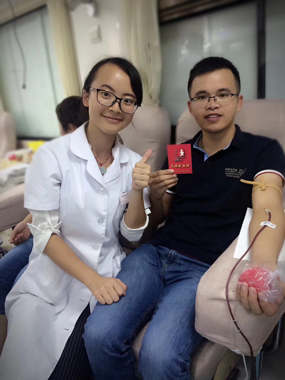 自从2015年两人谈恋爱开始,衷敬锋便开启了他的献血之旅,每年至少一次,从未间断。先从自己开始,而后带着妹妹、妈妈、同事纷纷加入无偿献血队伍来支持妻子的工作。这是他第五次献血,每次400毫升,已经累计献血2000毫升。不管是疫情期间,还是平时医院用血紧张的时候,只要有需要,他是第一个站出来支持妻子的工作的!尽管自己平时工作繁忙,他也会抽出时间来给妻子当志愿者,为献血者服务。
