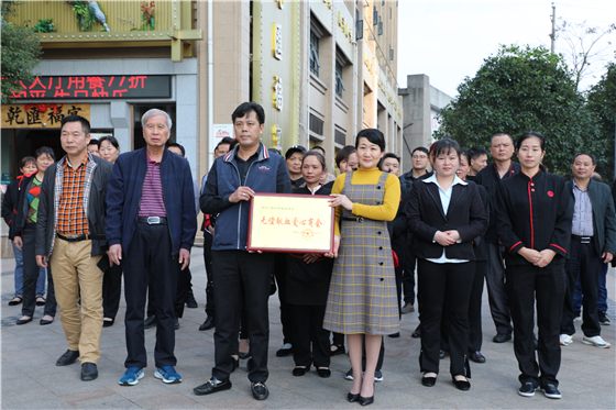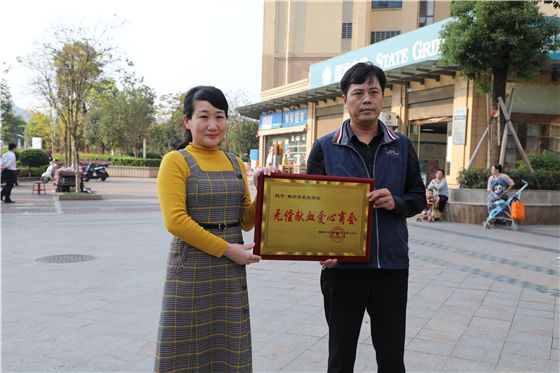 郴州市中心血站副站长史艾娟(左一)向郴州市耒阳商会会长陆秀成(右一)授牌