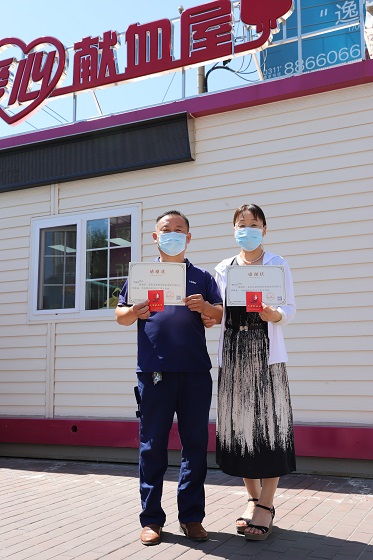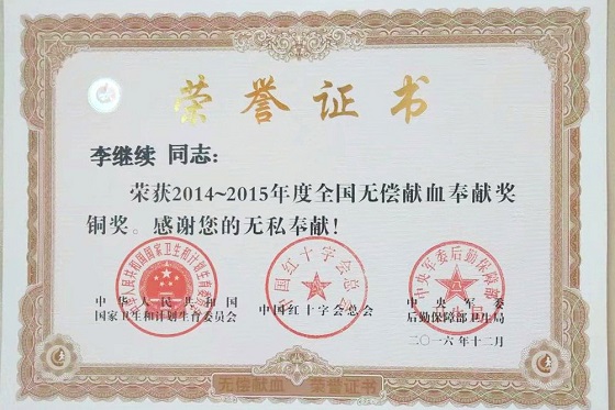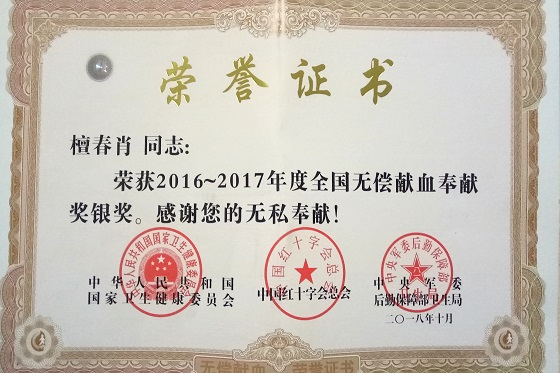 由于多年来的坚持,檀春肖和丈夫李继续分别荣获全国无偿献血奉献奖银奖和铜奖。檀春肖共捐献全血20次,8000ml;李继续共捐献全血16次,6200ml,而这份爱心事业还在继续,不会中断......