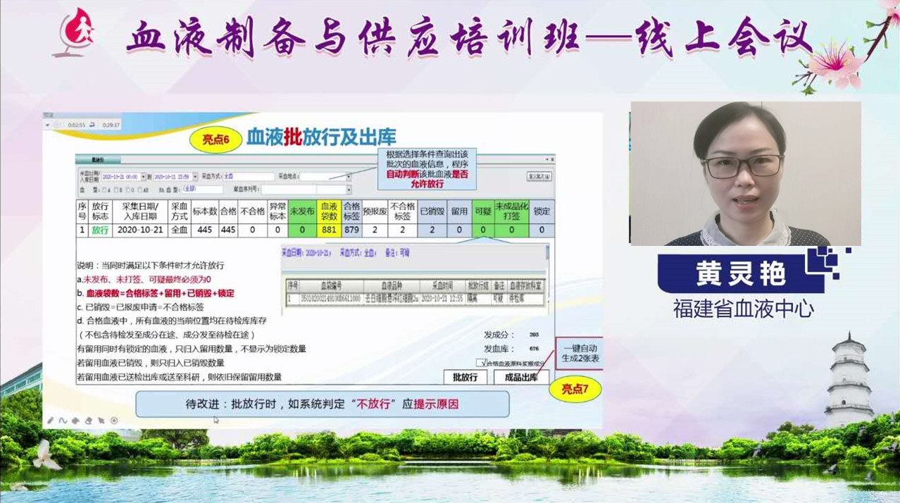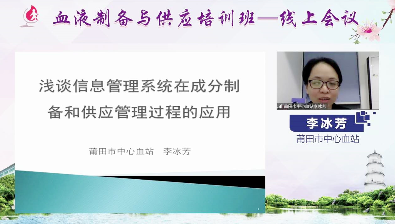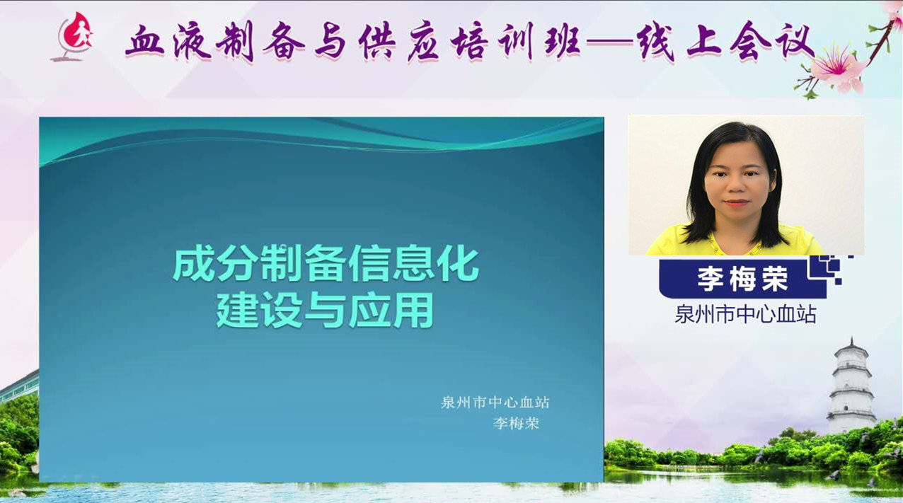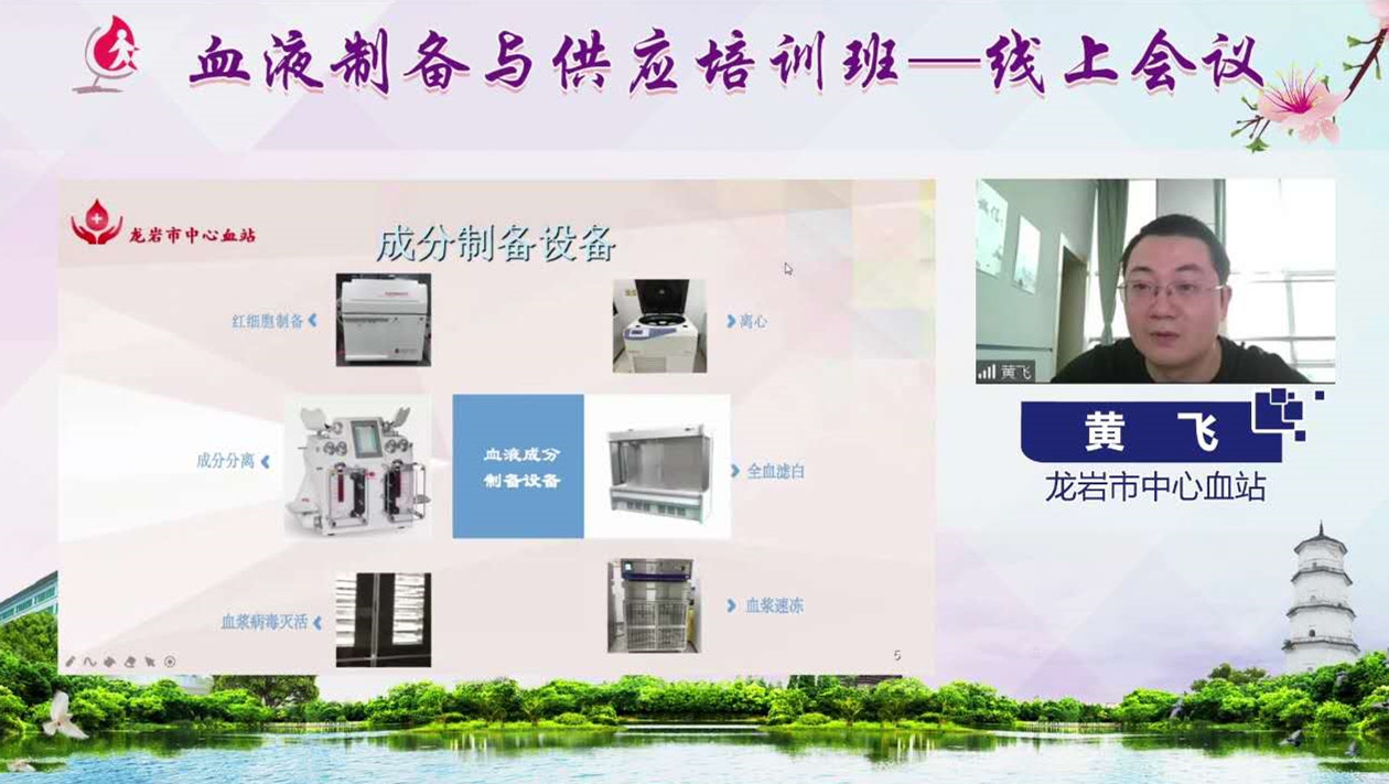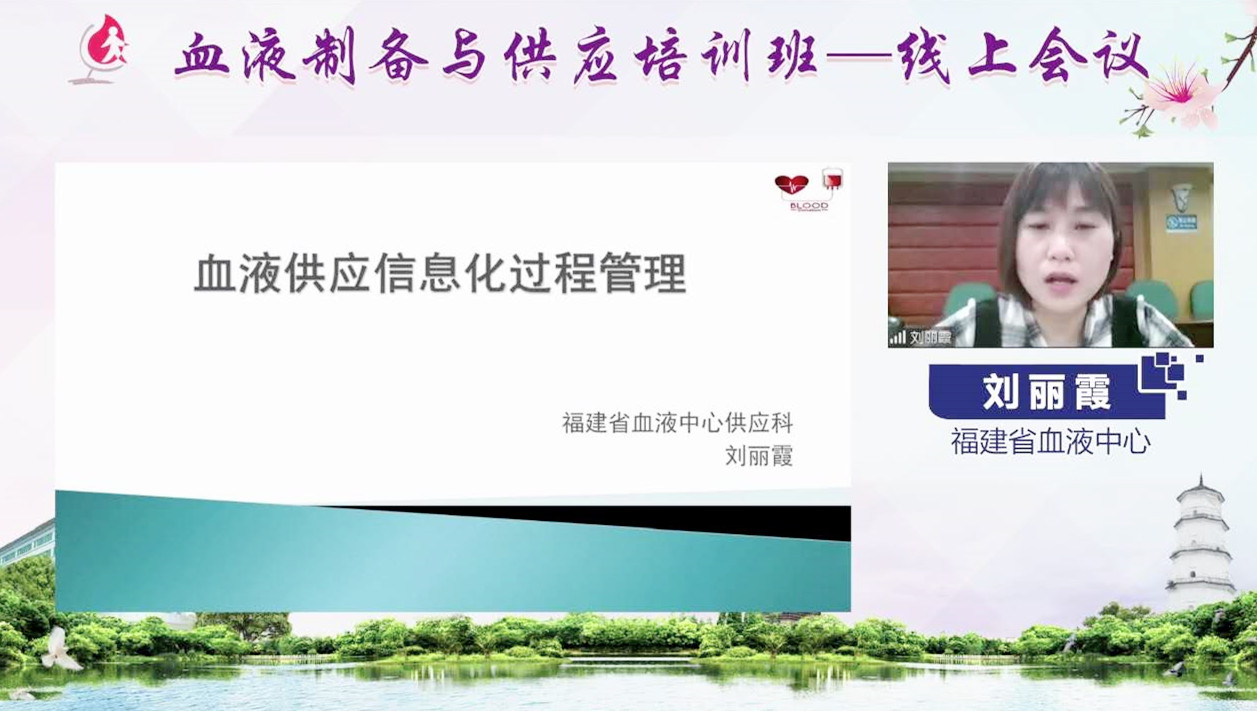 11月9日,福建省输血协会血液制备专业委员会主任委员、龙岩市中心血站站长黄丽平及福建省输血协会血液供应专业委员会主任委员、福建省血液中心副主任褚晓凌分别在培训班直播中致辞:黄丽平简要介绍了培训班的组织策划过程,强调加强信息化管理对于血液制备规范化、标准化和精细化的重要性,希望大家借此次线上培训的机会,积极互动交流,学有所获。褚晓凌对新冠疫情期间全省血站同仁们的团结协作和努力付出表示感谢,对此次培训班的课程内容进行了全面介绍,明确本次培训班的主题契合我省血站BMIS统一采用穿越系统并联网的大背景,希望大家积极分享宝贵经验。