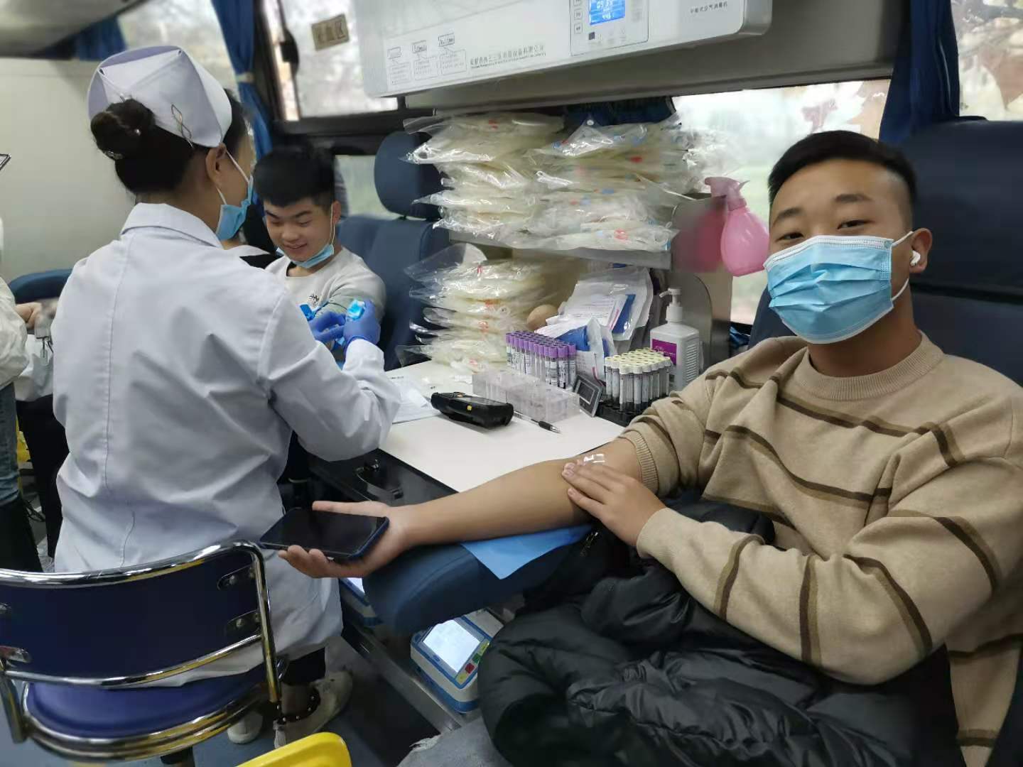 献血过程中,医护人员在做好个人安全防护的前提下,有序进行资料登记、测量血压和血型检测化验等献血前准备工作。滴滴鲜血,汇成大爱,一袋袋鲜红的血液就像是一颗颗生命的火种从学生们的身体里流出。学生们陆续走进献血车,撸起袖子,“打卡”无偿献血,担当“热血蒙面侠”。
