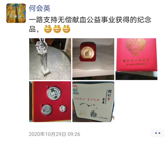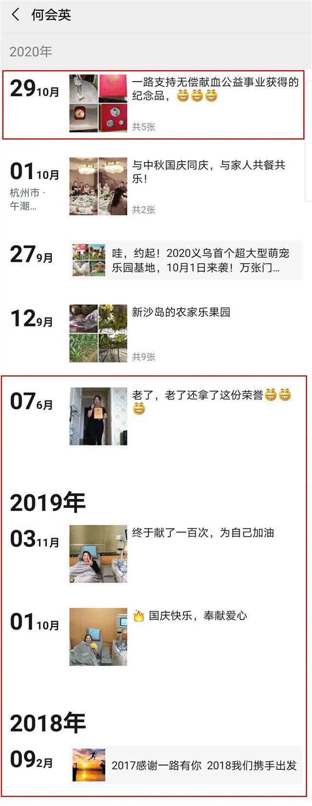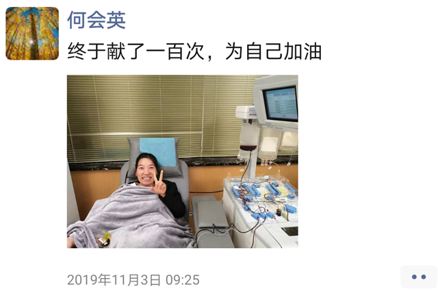 现在,何会英已经是一名“百次献血者”。性格内向的她,在献血的过程中,很少主动找周围人聊天;日常的工作闲暇时间里,她的娱乐活动也倾向于自己在家看看电视。但她对无偿献血,有着一种无声的自豪感。翻开何会英的朋友圈,一共8条内容里,有5条与无偿献血相关。