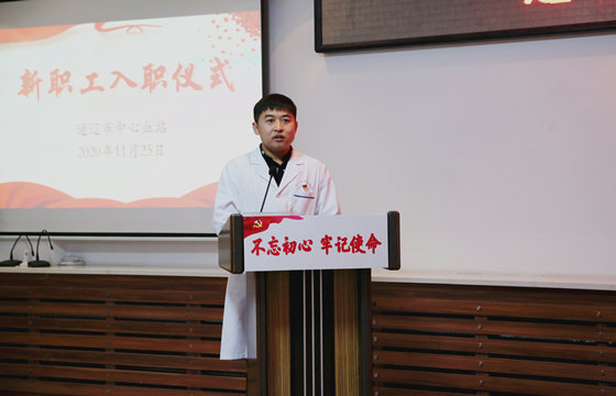 血站站长、书记金洁分别为14名新职工佩戴了工作牌,14个全新的身份诞生,在新职工代表王健的带领下,新职工们面向通辽市中心血站站旗进行入职宣誓,新入职党员在老党员带领下重温了入党誓词,铮铮誓言将引领新人开启新征程。
