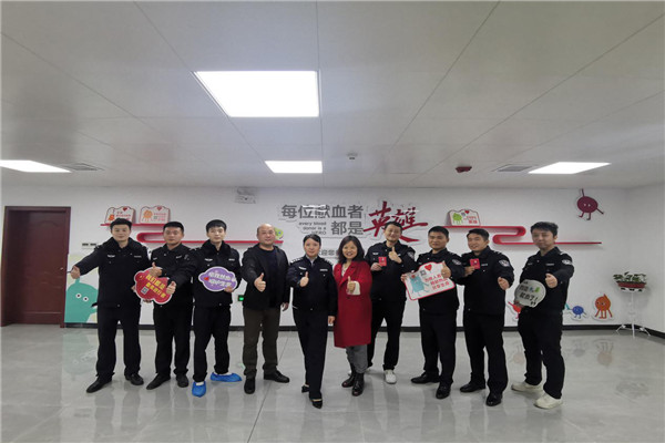 株洲市公安局工会副主席李艳、株洲市中心血站副站长刘娟与天元分局的干警们合影留念
