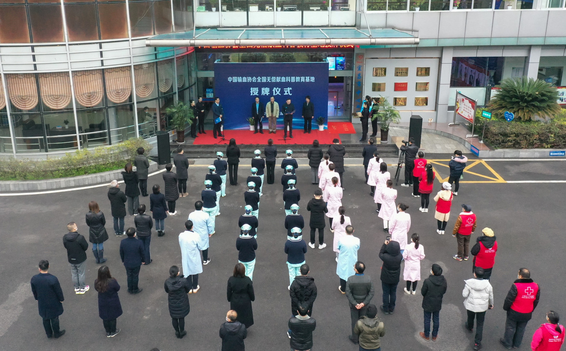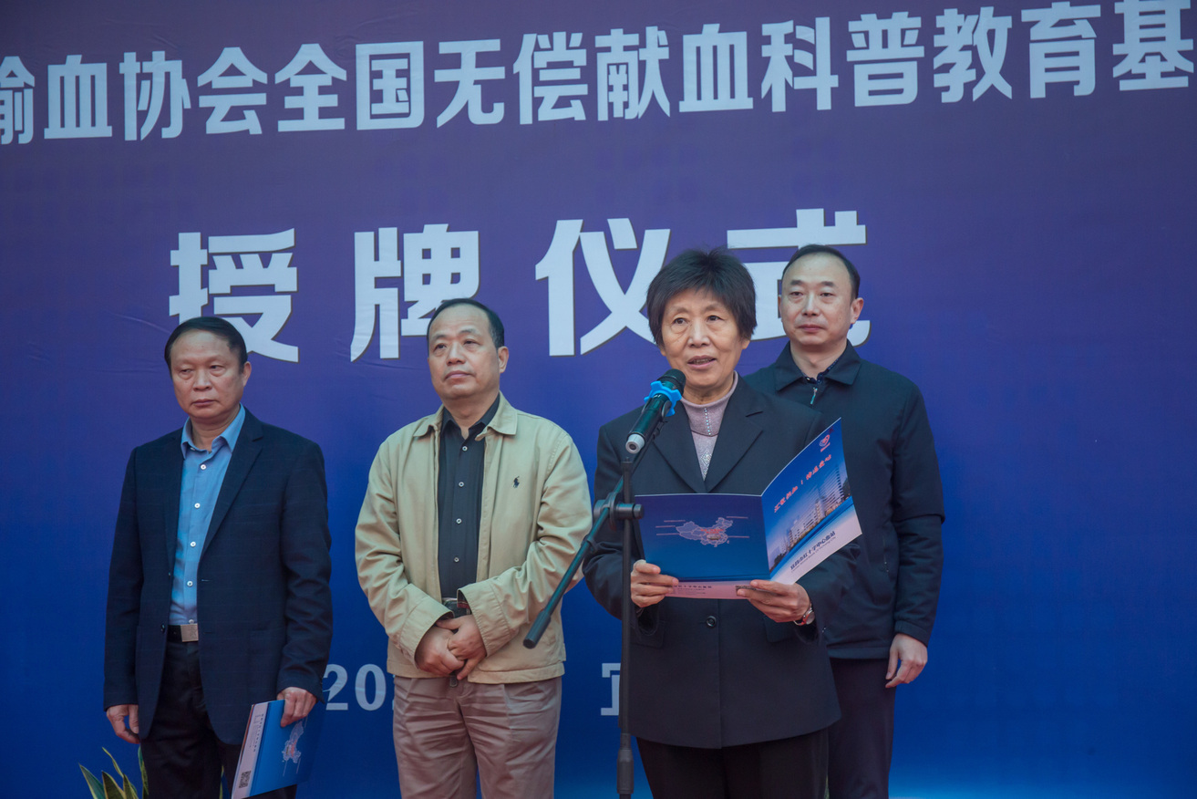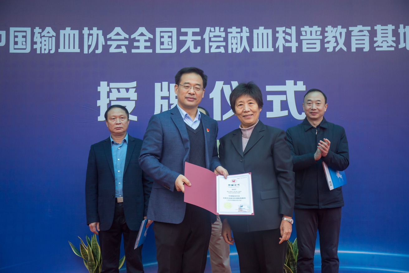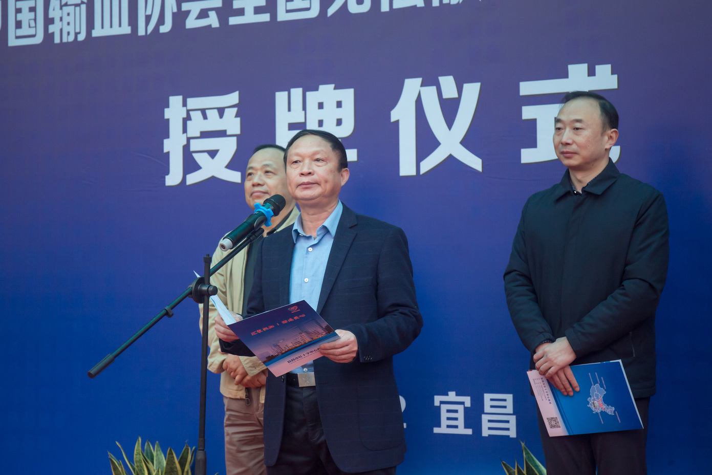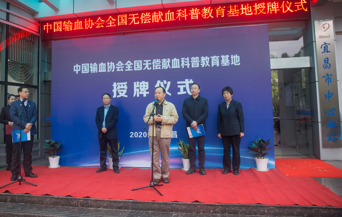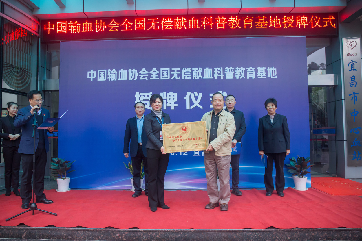 中国输血协会理事长朱永明为宜昌市红十字中心血站“中国输血协会全国无偿献血科普教育基地”授牌,宜昌市中心血站党总支书记张莉接牌。