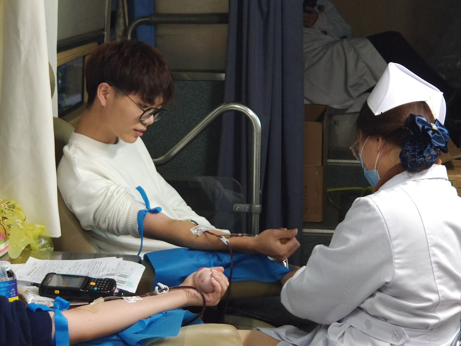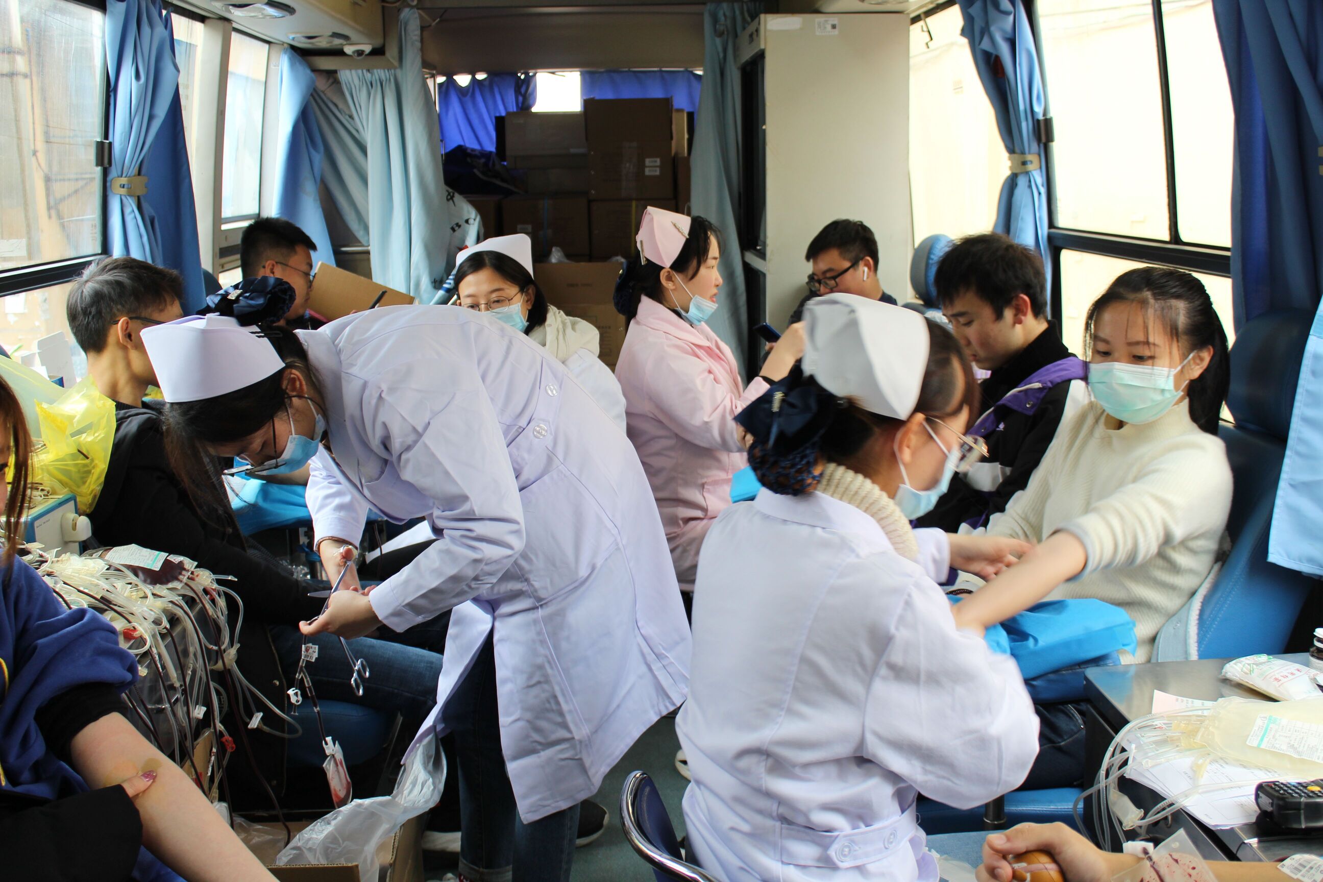 献血车内,志愿者们为献血者送上一杯温水、一盒牛奶、几句关怀的问候,一股股青春热血,一颗颗爱心满怀,每个人心里充满着参与无偿献血的光荣和自豪。