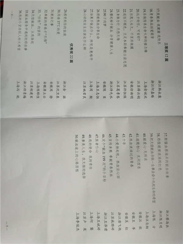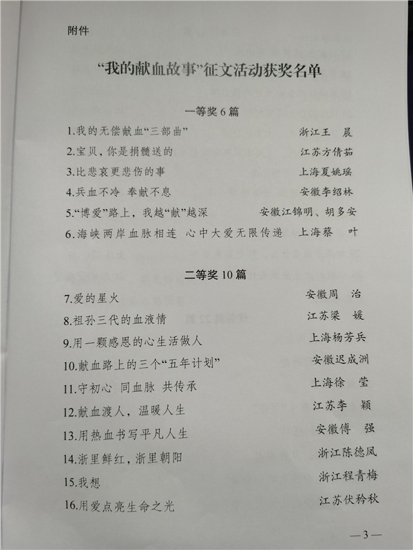 为深入贯彻党中央、国务院关于长江三角洲区域一体化发展的战略部署,加强沪苏浙皖无偿献血工作的交流合作,发掘和宣传无偿献血感人事迹,进一步促进无偿献血工作,培育和践行社会主义核心价值观,2020年8月,上海市红十字会、江苏省红十字会、浙江省红十字会、安徽省红十字会联合发布《关于开展“我的献血故事”主题征文活动的通知》,向沪苏浙皖地区无偿献血、无偿献血服务志愿者、工作人员以及关心支持无偿献血事业的各界人士或团队征集稿件,经过三个月左右的自评、初评、复评环节,最终在316篇投稿文章中评选出50篇优秀作品,其中一等奖6篇、二等奖10篇、三等奖12篇,优秀奖22篇。其中,我中心梁媛作品《祖孙三代的血液情》荣获二等奖,江苏省血液中心志愿者葛孝琴作品《身体力行 无怨无悔》荣获三等奖。我中心志愿者李小俊作品《我的献血故事》入围长三角评选活动。