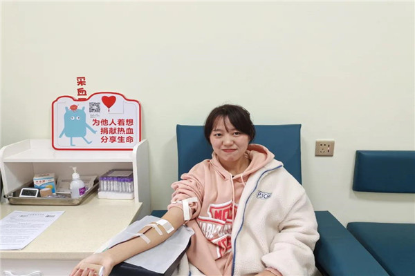 “以前经常看到有关无偿献血的报道,我也非常想尽一份自己的力量,希望这一点付出能为需要用血的人提供帮助。”正在献血的李佳敏说。这次是她第一次献血,虽然有点紧张,但仍然勇敢地捐献了300 毫升。