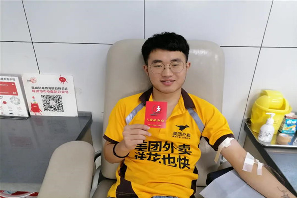 美团外卖员刘湘是位00后小伙,在工作间隙时他第二次来到攸县爱心献血屋捐血300毫升,并主动申请加入中华骨髓库,希望为白血病患者的康复出一份力。他说:“献血一直是我认为最正确、最有意义的一件事情,以后我也会继续献血,帮助更多的人。”