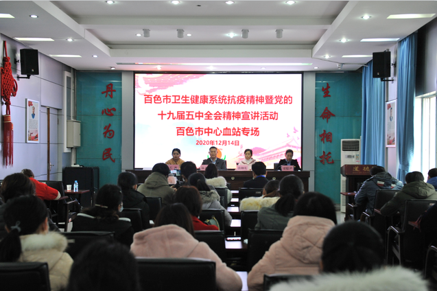 为深入学习宣传贯彻习近平总书记在全国抗击新冠肺炎疫情表彰大会上的讲话精神和党的十九届五中全会精神,由百色市卫生健康委组织的抗疫精神宣讲团于12月14日下午来到百色市中心血站,开展“百色市卫生健康系统抗疫精神暨党的十九届五中全会精神宣讲活动”。活动由血站党支部书记、站长梁朦尹主持,全站除值班人员外共六十余人到场参加活动。同时为给因工作没能到场的职工可以通过手机观看宣讲,本次活动通过微信视频号进行同步直播。