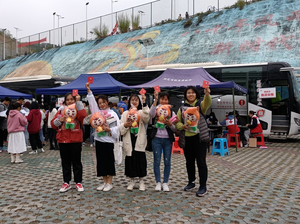 图为学生献血后领取网络无偿献血知识问答奖品后合影