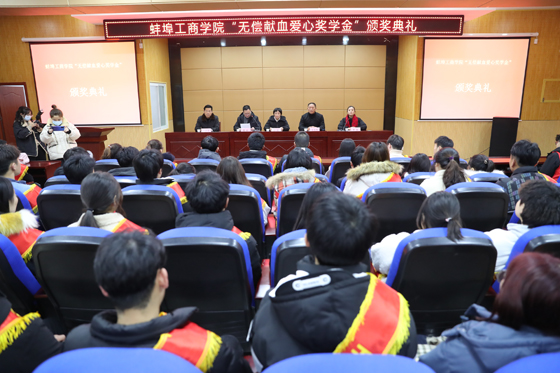 在深入推进三个专项行动大讨论活动中,市中心血站党支部为充分调动大学生参与无偿献血积极性,巩固和扩大大学生无偿献血志愿者服务队伍,表彰在参与无偿献血、投身志愿服务中表现突出的在校大学生,12月23日,在蚌埠工商学院成功举办第二届“无偿献血爱心奖学金”颁奖典礼。蚌埠市红十字会专职副会长孙林、市中心血站党支部书记、站长董柱、副站长余加宏、蚌埠工商学院学生工作部部长王东辉、蚌埠工商学院共青团团委书记黄颖等相关负责人和200多名师生代表出席仪式。