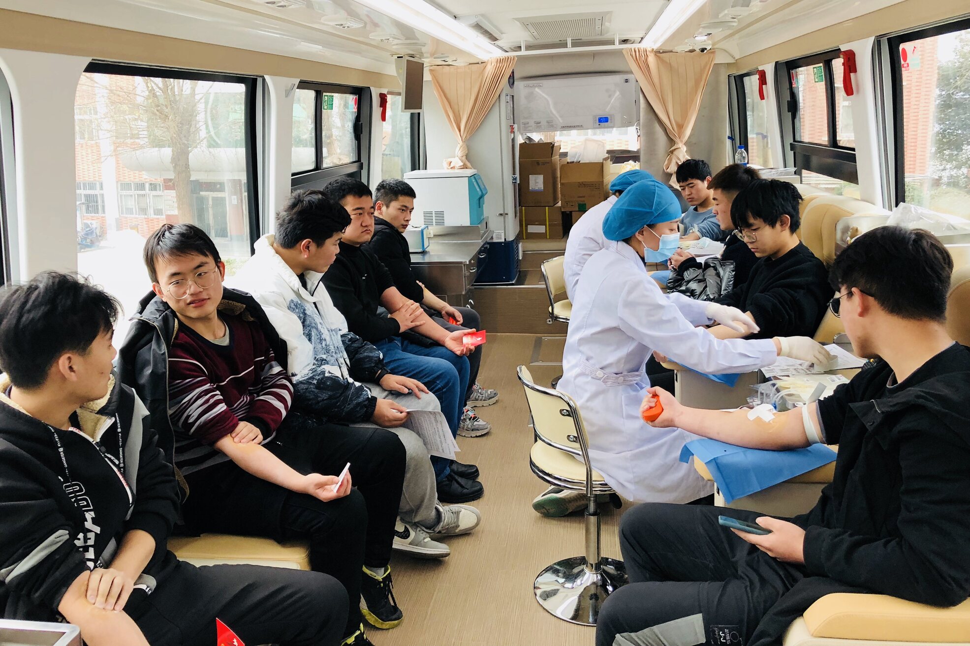 冬季的寒冷让同学们穿上了厚厚的外衣,然而这却并未阻挡住大家的献血热情。爱心献血车抵达校园之后,同学们利用课余时间陆续前来,有序排队捐献热血。截止发稿,已有130多名学生献血42000毫升。