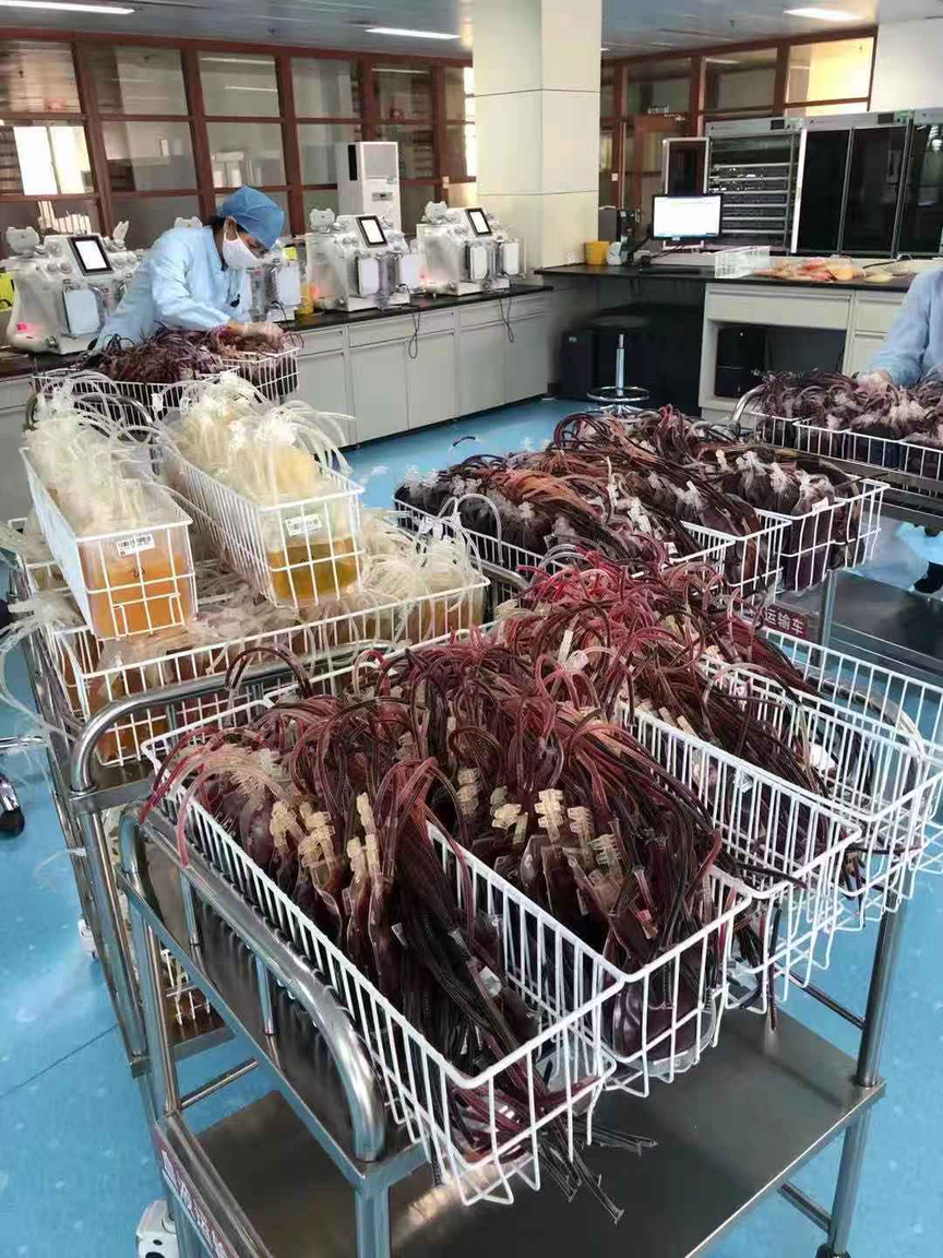 献血员们热情似火,积极献血,成分科的工作量也成倍增加。工作人员加班加点积极投入到成分血制备的工作中,每一步都严格按照工作要求完成,保证成分血质量,每天分离灭活上千袋成分血血液,让一袋袋爱心从献血员的血管流向病人的血管。