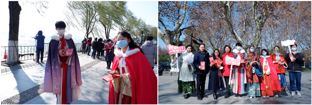 弘扬传统文化,践行公益初心。今天,来自浙江中医药大学第一临床医学院拂晓汉文化协会的学生、浙江省无偿献血志愿者协会“熊猫侠”队的志愿者们以及社会各界热爱汉服的热血志士,将“汉服快闪秀”和“庆祝《浙江省实施<中华人民共和国献血法>办法》修订施行七周年”的宣传活动带到了西湖边上的青少年宫献血点。