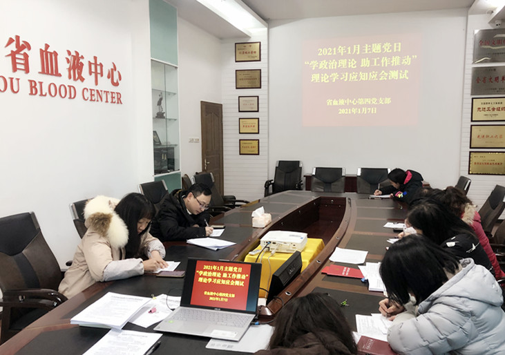为及时了解掌握支部党员政治理论学习情况,检验支部开展政治理论知识学习的成果,推动支部党员职工理论学习往实里走、往心里走,2021年1月7日,省血液中心第四党支部组织开展了主题党日活动。