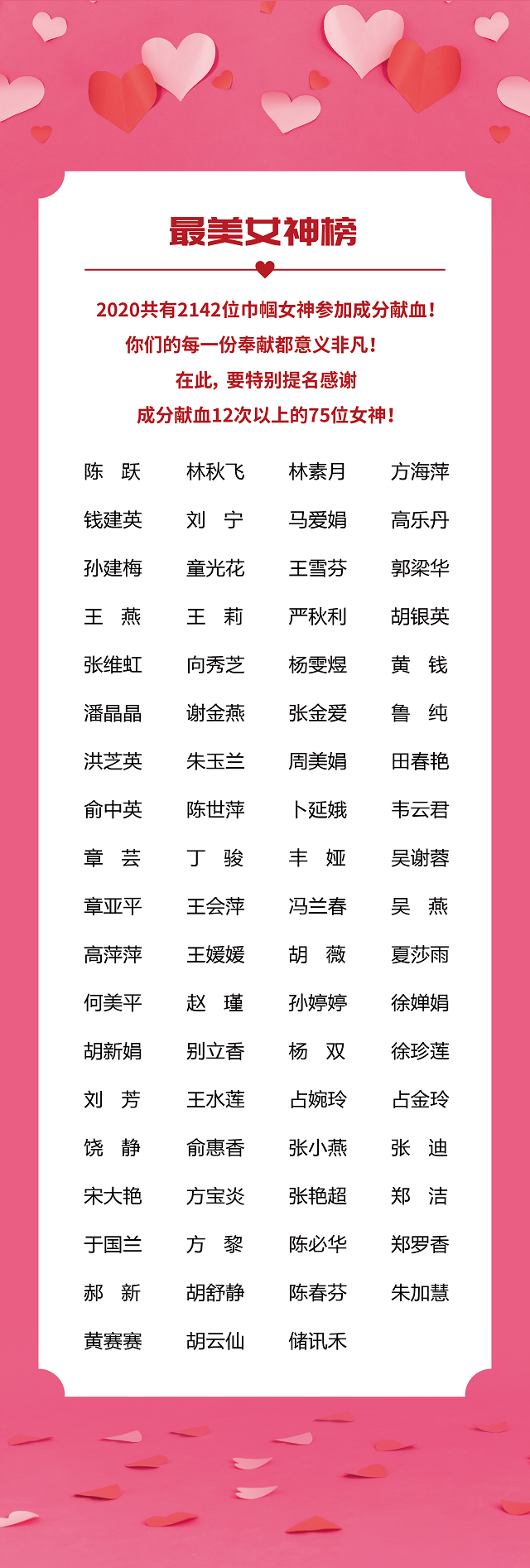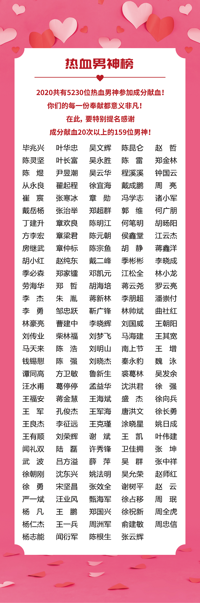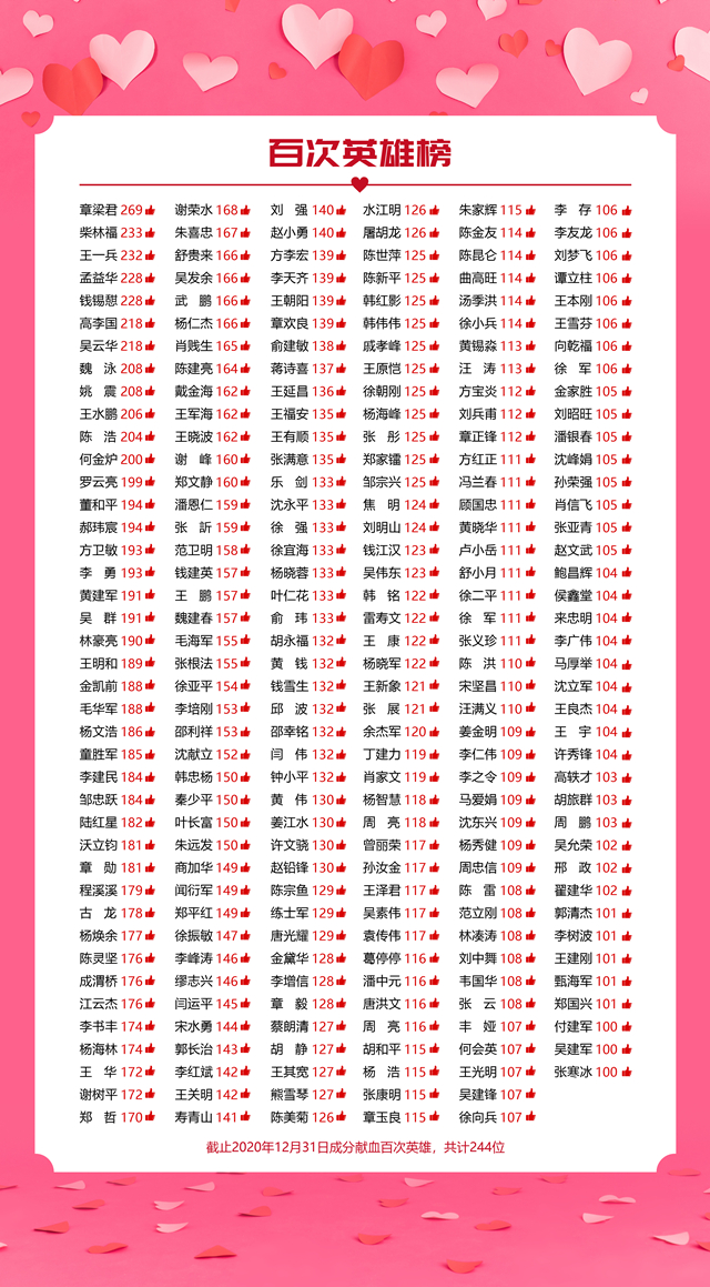 生命的意义就在于风霜雪雨洗礼后的坚韧不屈生机勃发,2020年共有5230位热血男神和2142位巾帼女神参加成分献血!由于篇幅有限,在这里未能全部提及每一位的名字,但您的每一次奉献都意义非凡!都闪亮着属于您的美丽光芒!在此,要特别提名感谢2020年成分献血20次以上的159位男神和成分献血12次以上的75位女神,你们都是真善美的代言人!现将你们的名字在以下《光荣榜》予以公布,并对你们的高尚行为表示最崇高的敬意和衷心的感谢!
