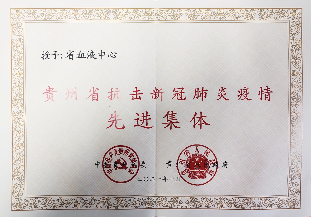 1月8日,贵州省委、省政府对全省抗击新冠肺炎疫情先进个人和先进集体进行了表彰,授予513位同志“贵州省抗击新冠肺炎疫情先进个人”称号,授予299个集体“贵州省抗击新冠肺炎疫情先进集体”称号。表彰中,贵州省血液中心获“贵州省抗击新冠肺炎疫情先进集体”荣誉称号。