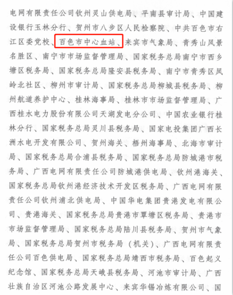 2020年11月20日,根据中央精神文明建设指导委员会下发的《中央文明委关于复查确认继续保留荣誉称号的全国文明城市、文明村镇、文明单位、文明家庭、文明校园的通报》(文明委〔2020〕9号),百色市中心血站顺利通过“全国文明单位”复查验收,继续保留“全国文明单位”荣誉称号。