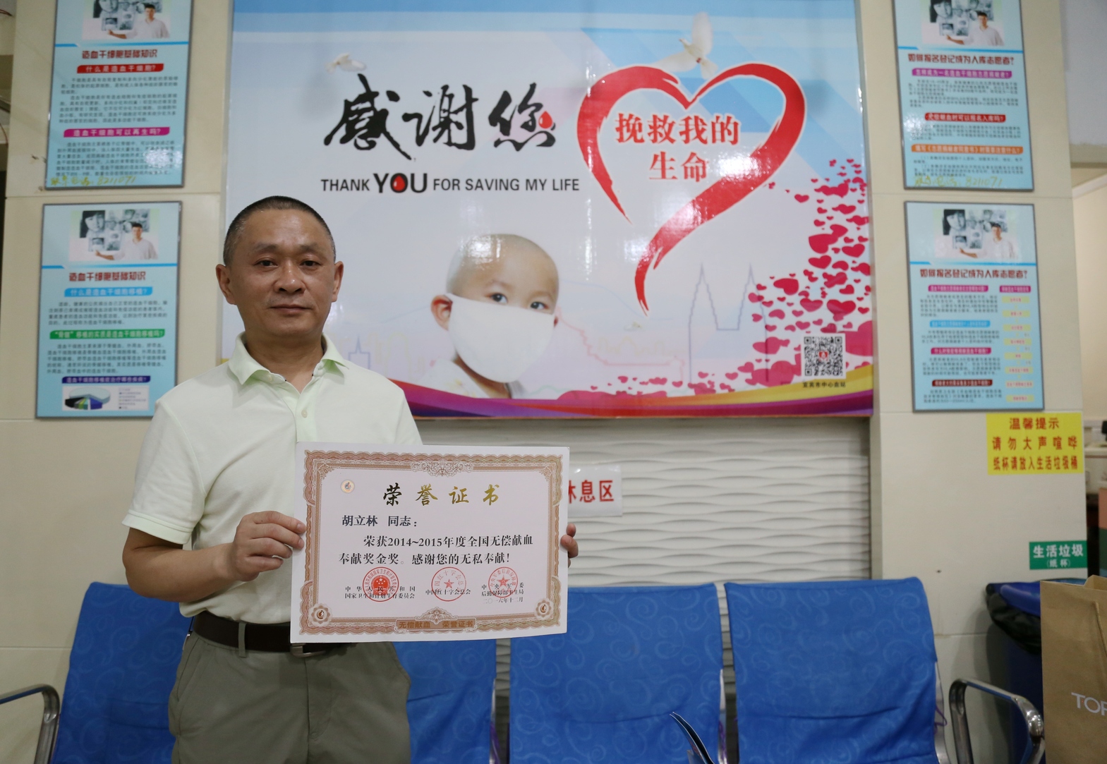 在受到全国表彰的志愿者人群中,现年52岁的宜宾市黄桷庄电总厂职工胡立林是多次获得“全国无偿献血奉献奖”表彰的志愿者,胡立林从2002年开始献血以来,先后 21次捐献全血7800毫升,72次捐献单采血小板86个治疗单位。而今,胡立林囊括了“全国无偿献血奉献奖”金、银、铜奖所有的奖项,他获奖的过程见证了宜宾无偿献血社会公益事业发展的历史进程。2008年,他首次荣获了“全国无偿献血奉献奖”铜奖时,宜宾首次荣获了“全国无偿献血先进市”光荣称号。2015年,胡立林首次荣获“全国无偿献血奉献奖”金奖。到目前为止,宜宾市已连续6届荣获了“全国无偿献血先进市”光荣称号,胡立林再次荣获“全国无偿献血奉献奖”金奖。“达者皆济天下!能为分享我生命的人做更多事情,是我们志愿者共同的愿景与价值追求。”胡立林是这样说的,更是这样做的!胡立林参加献血活动18年来,他用自己的热血和无私的爱,为无数患者和家庭带来新的希望。他兜里的10多本献血证,记录着他一路走来的光荣与梦想!