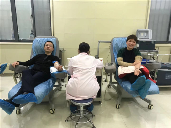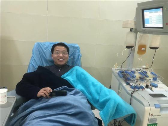 (市中心血站检验科主任王业坤正在捐献机采血小板)