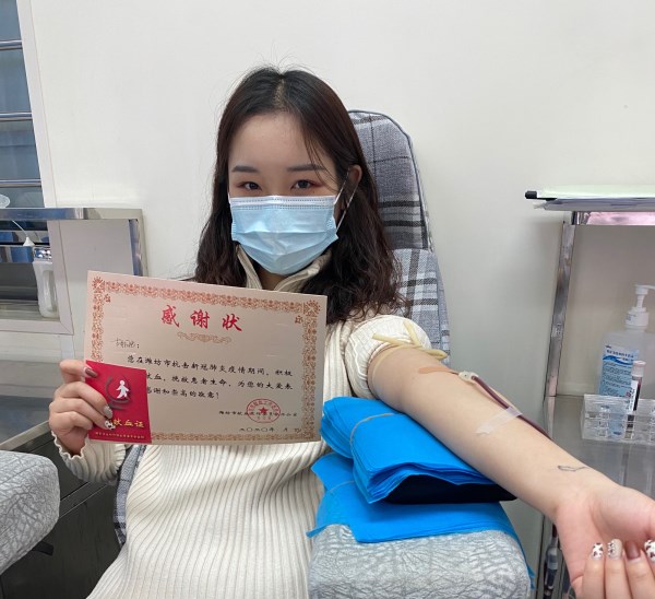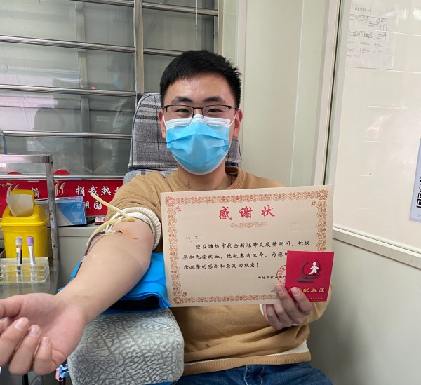 当天,大四学生胡国男和代一方先后来到献血屋奉献爱心,因疫情特殊时期均佩戴口罩并保持安全距离,起初二人并未相互留意对方。献血结束后,当血站工作人员再次核对献血者姓名时,两人才发现坐在相邻采血椅上的竟是四年未见的老同学,这让二人欣喜不已。刚放寒假,二人都希望在假期里做件有意义的事情,也算为疫情防控做一份贡献。没有想到的是,一个爱心举动,竟能与久未谋面的老同学相逢,真是意外的收获和感动。相互之间简单的问候与鼓励使献血屋充满了欢声笑语。