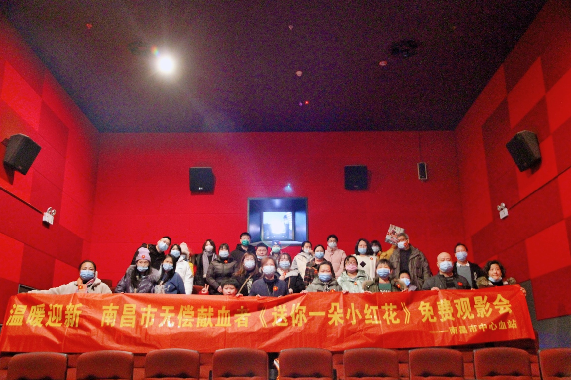 为感谢广大无偿献血者在疫情期间的热血相助,南昌市中心血站在16日、17日开展《送你一朵小红花》新年观影活动,温暖开年,共享生命中的感动。共有130余名献血者到场观影,正式观影之前,影院做好了消毒工作确保观影者安全。