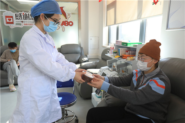 “今天是腊八节,又是我第一次献血,真的很特别。”第一次参加献血的90后小姑娘章美面带微笑地说。当她得知成分献血的间隔期是14天时,她马上打电话给献血量已满4000毫升的表弟,约他明年一起来献血。“献爱心,防疫情,一样都不能落下。”来自安徽的章美告诉我们,为了积极响应疫情期间的疫情防控政策,今年过年不回老家了,选择在浙江杭州过年,也感受一下这里的过年氛围。